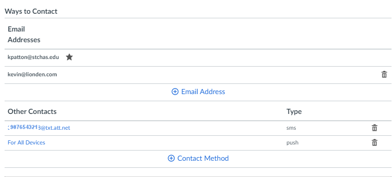 To set Canvas to post announcements to an alternate email, click on Account (left navigation bar), then select Settings, then (under Ways to Contact) make sure your SCC email address is correct. At this time, you can add other email addresses if you like. You can also add a text (SMS) address, so you’ll also be notified by text message of any new course announcement.